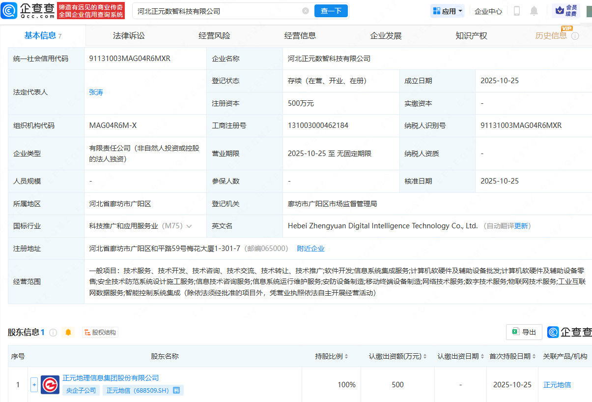 近日,河北正元数智科技有限公司成立,法定代表人为张涛融易盈,经营范围包含:信息系统集成服务;信息技术咨询服务;;安防设备制造;移动终端设备制造;智能控制系统集成等。企查查股权穿透显示,该公司由正元地信(688509)全资持股。